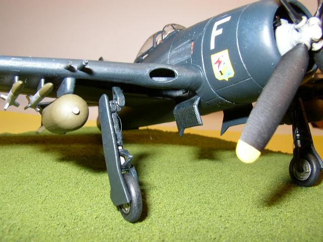 Testors F8F-2, while a very old kit (I’ve read that it was originally issued by Hawk circa 1967), is a decent representation of the Bearcat and is very reasonably priced. The panel detail is a mixture of raised (fuselage) and recessed (wings & stabilizer). The overall detail is pretty basic, with the cockpit only containing a seat and instrument panel (decal for dials), open wheel wells (not boxed-in) with minor ribbing detail, and simplified main landing gear, with no retraction strut parts supplied. Ejector pin marks are present on the interior of gear covers, struts, ordnance, etc. Canopy and windscreen pieces are a bit thick. Ordnance stubs are molded on the wing undersides, however, the kit does not provide bomb sway-braces. Armament consists of two 500 lb. bombs and four 5-inch rockets (HVARs) with a centerline fuel tank (suitable for a recce pod for a F8F-1P field modification). Cannon barrels are molded onto the wing leading edge. The tail wheel, engine and propeller are nicely molded and, while the cowl shape is somewhat narrow in profile, the overall dimensions of the kit look good. A pilot figure is included.